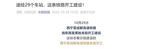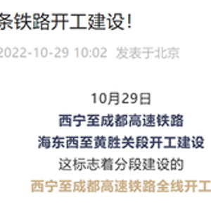 据中国铁路总公司微信公众号“中国铁路”消息,西宁至成都高速铁路海东西至黄胜关段已于当日全面开工建设,这也标志着分段建设的西宁至成都高速铁路全线开工。