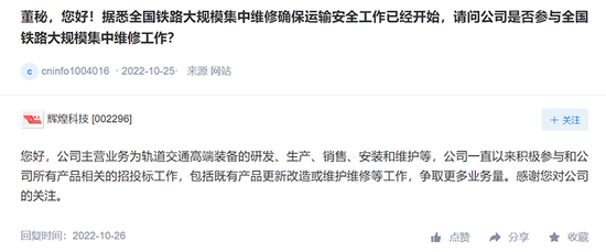 对于业务拓展,辉煌科技称一直以来都在积极参与相关产品的招投标工作,包括既有产品更新改造或维护维修等工作,旨在争取更多业务量。