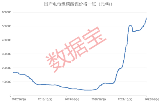 锂电池是新能源车三大件中最关键的部件。随着锂电池出货量走高,上游锂矿资源紧俏。今年以来,锂矿价格持续上涨。截至2022年10月末,国内电池级碳酸锂价格已达到55.8万元/吨,创历史新高,相比2019年初涨幅超过6倍,年内涨幅超过2倍。