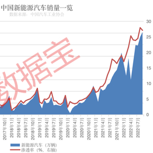 近年来,以比亚迪、特斯拉、蔚小理为首的新能源车企发力,中国新能源车销量大增。根据中国汽车工业协会数据,2019年1月中国新能源车销量9.57万辆,市场渗透率为4.04%,到2022年9月,新能源车销量增至70.75万辆,销量创历史单月新高,也是国内新能源车首次单月销量破70万辆,市场渗透率达到27.11%。