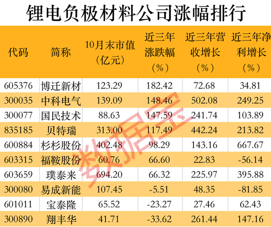 数据宝统计,A股中负极材料公司有10家左右,包括璞泰来、杉杉股份、贝特瑞等300亿以上市值公司。相比较于锂矿及正极材料公司,负极材料业绩增幅相对较低,中科电气、贝特瑞等近三年营收增超4倍。