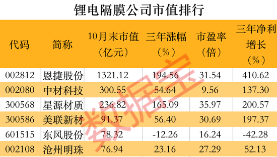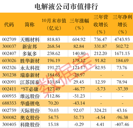 数据宝统计,A股中电解液公司有13家左右,包括行业龙头天赐材料、新宙邦、多氟多等,近三年净利分别增长47倍、16倍和5倍。