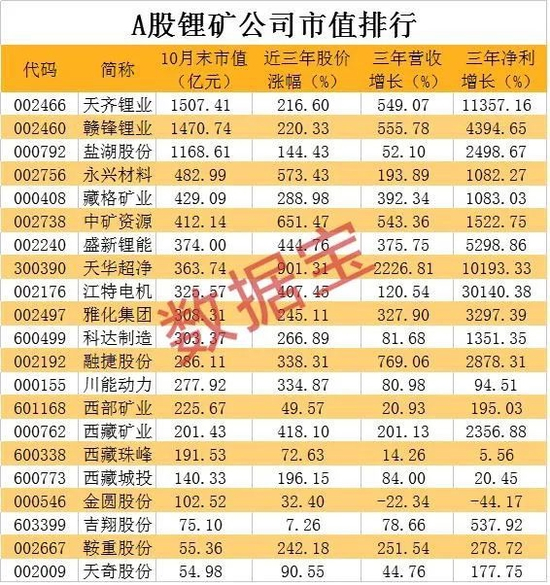 作为锂电最上游产业链,锂矿受益明显。证券时报·数据宝统计,A股中布局锂矿公司有20余家,总市值超过8300亿元,行业龙头包括天齐锂业、赣锋锂业、盐湖股份三家千亿市值公司。