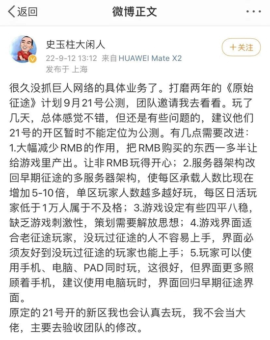 于是,2022年9月12日,针对正在打磨的新一代产品《原始征途》,史玉柱在微博中即明确表示,要“大幅减少RMB的作用,把RMB购买的东西一多半让给游戏里产出。让非RMB玩得开心”。