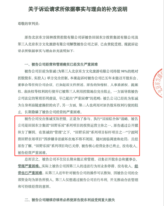 张涛方面提供给法院方面的文件称,被告公司交由张诚实际控股,是为了参与、执行“田园综合体”战略,被告公司是田园东方集团“田野乐园”系列项目的投资运营主体之一。