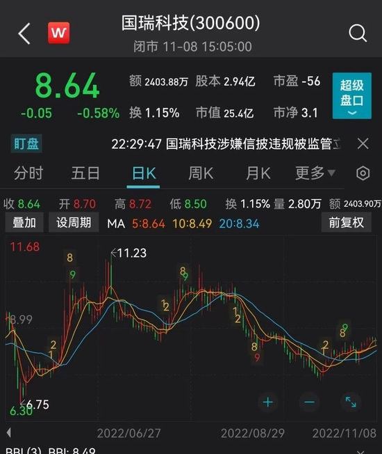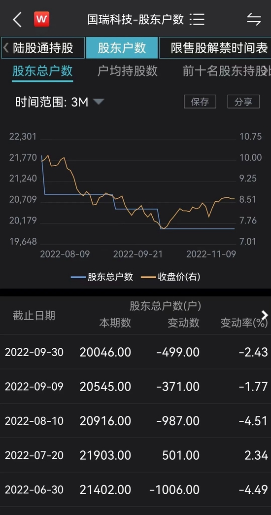 截至11月8日,国瑞科技股价为8.64元,最新市值25.4余元。最新股东户数为2万户。
