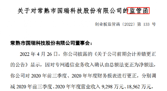 另外,2022年4月26日,公司披露《关于公司前期会计差错更正的公告》显示,因对专网通信业务收入确认由总额法更正为净额法,公司对2020年前三季度、2020年年度财务报表进行更正,分别调减2020年前三季度、2020年年度营业收入9298万元、18562万元,占更正前营业收入的比例分别为47.74%、32.55%。该事项被深交所下发监管函。