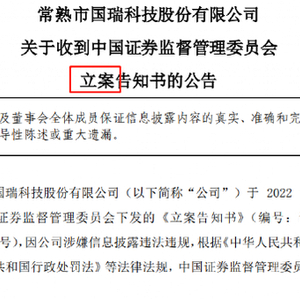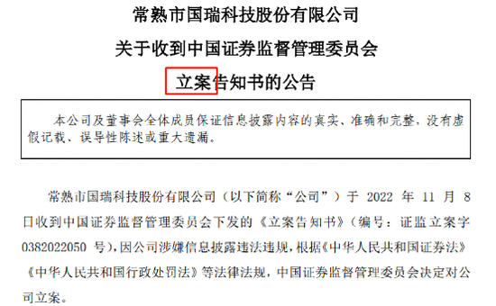 11月8日晚,国瑞科技公告,于2022年11月8日收到《立案告知书》(编号:证监立案字0382022050号),因公司涉嫌信息披露违法违规,根据《中华人民共和国证券法》《中华人民共和国行政处罚法》等法律法规,中国证监会决定对公司立案。公司称将积极配合证监会的立案调查工作。