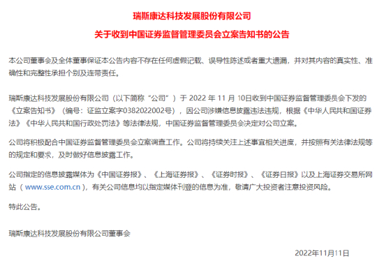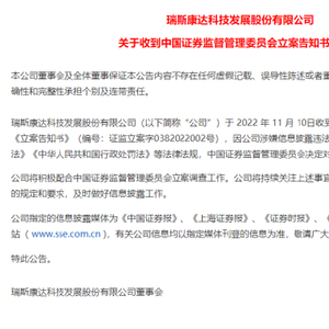 11月10日晚间,瑞斯康达发布公告称,收到证监会下发的《立案告知书》,因公司涉嫌信息披露违法违规,根据《中华人民共和国证券法》《中华人民共和国行政处罚法》等法律法规,证监会决定对公司立案。