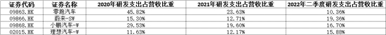 今年上半年,零跑汽车的研发支出占营收比重排名四家公司中倒数第一。研发投入是一家车企打造技术竞争力的指标之一。2020年至2021 年,零跑汽车研发投入占营收比重远高于“蔚小理”,而今年上半年,零跑汽车在研发投入金额以及研发投入占营收比重均不及另外三家造车新势力。