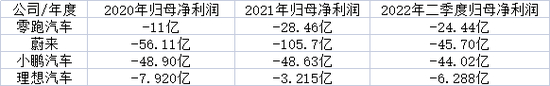 以零跑汽车为例,2010年至2022年上半年,三个报告期合计亏损超63亿元。蔚来和小鹏亏损金额更大,均超过百亿以上。理想汽车亏损金额最低,近三个报告期不到18亿元。