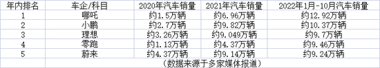 截至2022前10月,哪吒已经反超小鹏,以12.92辆销量位居造车新势力第一位。零跑汽车也在追赶,前10月累计销量约9.46万辆,位居第四,在蔚来之上。