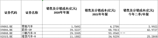 2022年上半年,零跑汽车的销售开支为3.992亿元,远低于蔚来和理想的42.97亿元和25.28亿元。