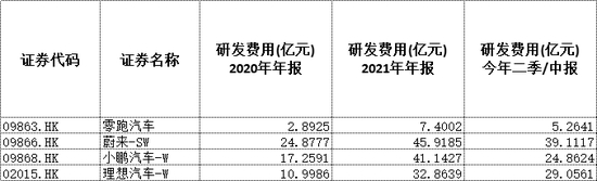 研发方面,在2020年-2022年上半年期间,零跑汽车的研发费用均未超过8亿元。与之相反,蔚来、理想汽车、小鹏汽车的研发费用均在10亿元以上,且今年上半年它们都保持在24亿以上。