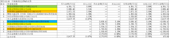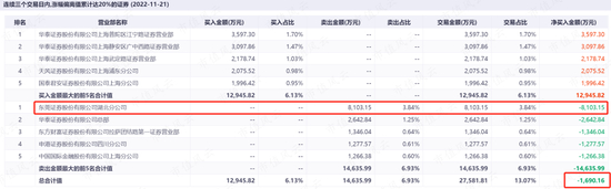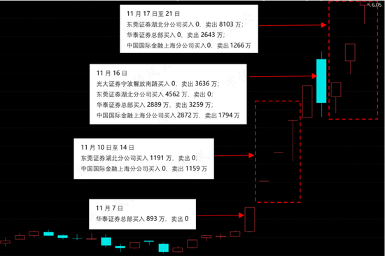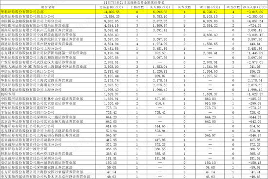 11月7日至21日的龙虎榜数据中,按成交金额排名,华泰证券总部高居榜首且频频登上龙虎榜,交易金额达1.48亿,其中买入6092万,卖出8708万,净卖出2615万,表明其在这波上涨过程中频繁买卖且已基本落袋。
