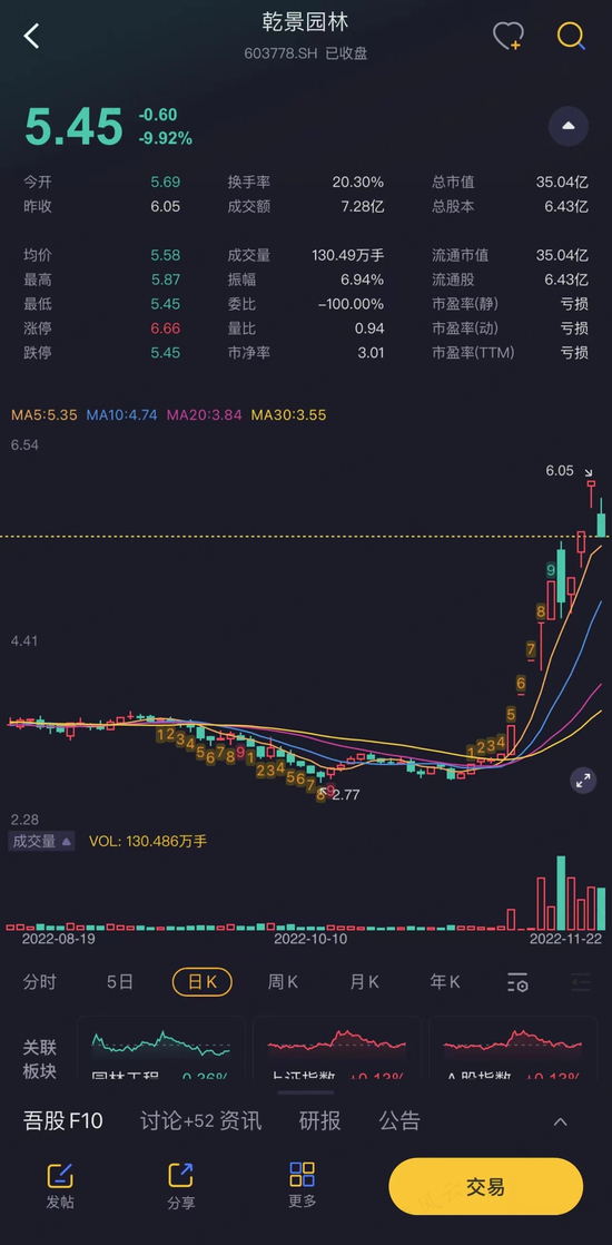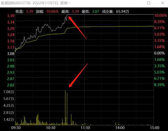 自11月7日发布公告至21日,仅9个交易日,乾景园林股价就飙涨96%,成交量激增,与前4个月里无人问津的状态简直是云泥之别。