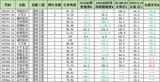根据吾股行业独家分类,上市公司中与园林工程相关度在50%以上的有20家,其中2018年营收同比下降的公司有4家,2021年这一数据已扩大到11家,今年前三季度进一步上升至17家。