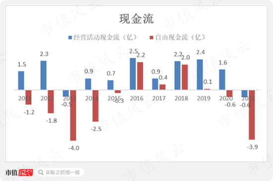 不过从真金白银来看,2011-21年间,公司经营活动现金流累计13.8亿,但自由现金流却为-9.5亿,说明赚了钱又全部投到机器设备厂房了。