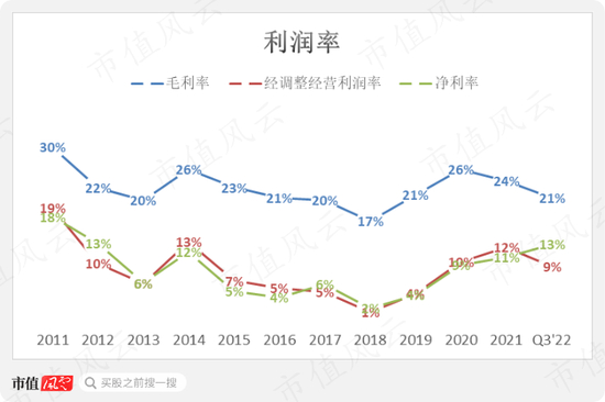 上市以来,公司毛利率呈现一定的周期性,大致在20%上下波动,没有大富大贵,但也过得去,最直观的表现就是历年从来没有亏过。