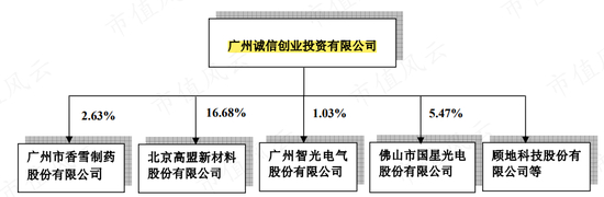广州诚信远在2011年公司上市前后就已经投资了不少上市公司,比如广州香雪制药(300147.SZ)、北京高盟新材(300200.SZ)、广州智光电气(002169.SZ)、佛山照明(000541.SZ)控股的国星光电(002449.SZ),以及顾地科技(002694.SZ)。