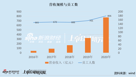 五年间,营收涨超40倍,营收由2016年的9亿元上涨至2021年的372亿元;股价自上市以来涨超20倍,由上市首日开盘价5.94元/股上涨至126.13元/股。