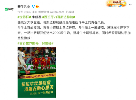 由于有官赞身份,蒙牛在宣传上,也显得更顺理成章。比如11月24日凌晨,伊利签约的西班牙队7:0大胜哥斯达黎加,但好像跟伊利没啥关系。