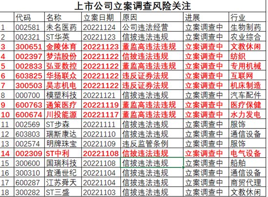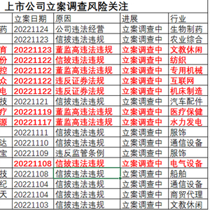 上市公司立案调查风险关注,数据来源:通达信