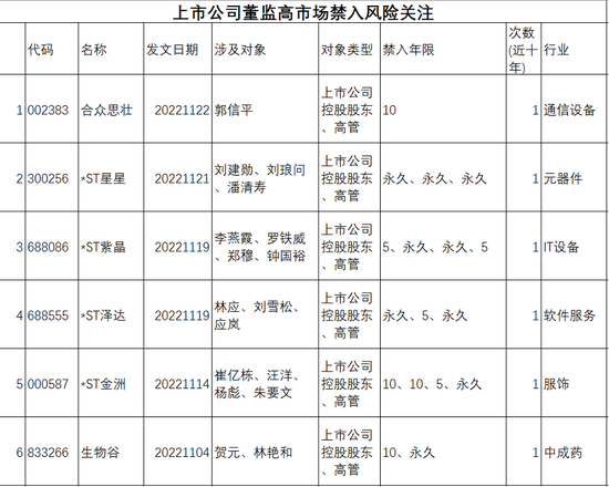 上市公司董监高市场禁入风险关注,数据来源:通达信