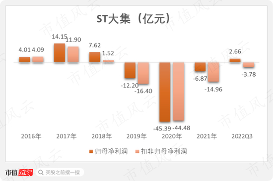 从业绩来看,ST大集已经连续巨亏三年,2019-2021年归母净利润合计-64.47亿元,扣非归母净利润合计-75.84亿元。