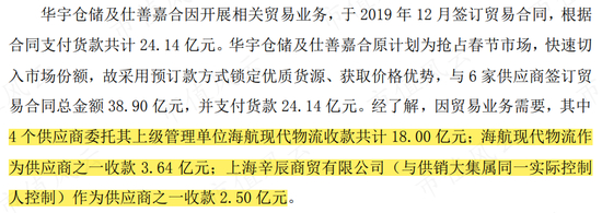还是在2019年12月,华宇仓储与仕善嘉合随及开始贸易业务,签订贸易合同,并快速支付了24.14亿元。
