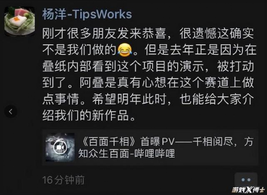 《帕斯卡契约》制作人杨洋在为《百面千相》打Call的同时,也提及了自己的新作