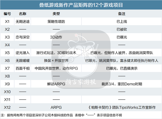 另外,叠纸至今未曝光的在研项目还包括,X12项目为TipsWorks工作室的新作,另外据说还有两个项目是叠纸全资收购的深圳木狼科技在研的项目,此外有内部人士透露X2这个项目已经被砍掉了。
