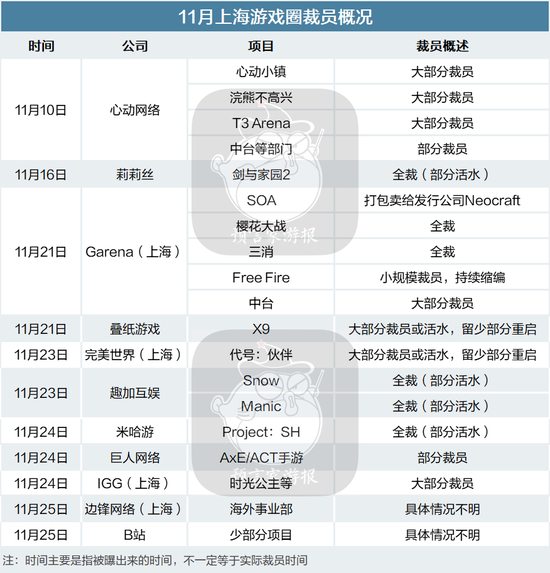 尤其是号称游戏人才魅力之都的上海,在11月迎来了史上最多的裁员:先是B站董事长陈睿亲自接管游戏业务,不久,心动游戏、趣加互娱、Gerena接连传来大幅裁员的消息,尔后,叠纸、完美上海、巨人、IGG的部分项目组也传来某几个项目组裁撤,就连年入300亿流水的米哈游,也在这个风气下裁撤了1个项目组。