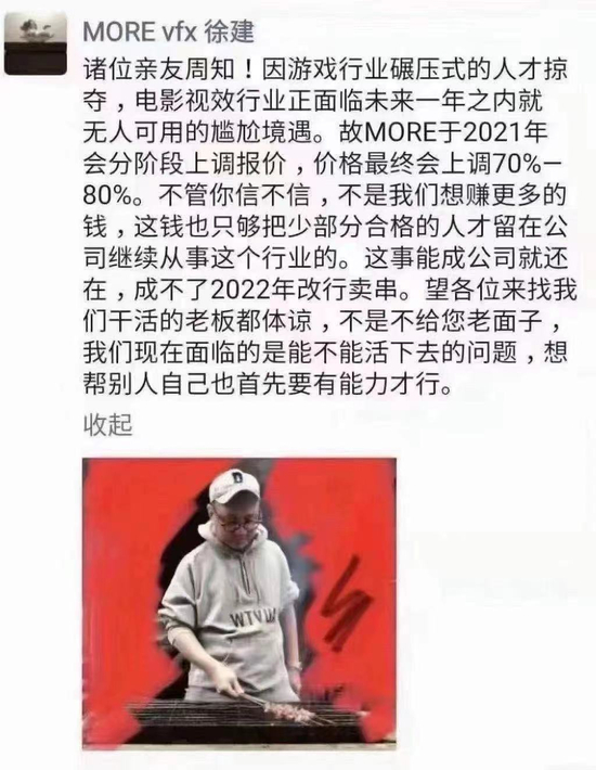 更疯狂的是,上海游戏圈的薪资涨幅还对影视圈形成了压迫。视效制作公司MORE VFX创始人徐建曾发布朋友圈,吐槽游戏行业正在进行“碾压式的人才掠夺”,说为了留住员工,准备把报价上调70%-80%。《唐人街探案》系列导演陈思诚也在路演时提到过这个例子。