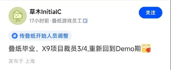 近期让叠纸卷入裁员传闻的是X9项目,叠纸被裁员工匿名披露X9项目裁员75%,重新回到Demo时期,虽然改游戏名称未知,但据称类型是解谜ARPG手游。至于裁员原因,该员工则表示猜测是公司资金链紧张。另外,该员工还透露了X5项目《逆光潜入》制作人被开,现在由老板接手这一信息。其实早在今年9月,就有消息称叠纸某核心项目组战斗策划被全部裁掉,不过并不能确认是哪个项目,但也可见叠纸部分在研项目的开发过程颇为不顺。