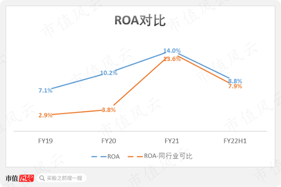 公司ROA跟行业水平保持同向变动,但是始终高于均值,最新数据为8.8%,高于行业水平7.9%。