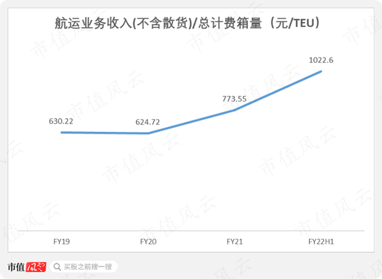平均运价也从630.2元/TEU增长至1022.6元/TEU。