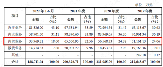 虽然近年来内贸业务销售额持续增长,但是占比却从24.38%下降至18%。