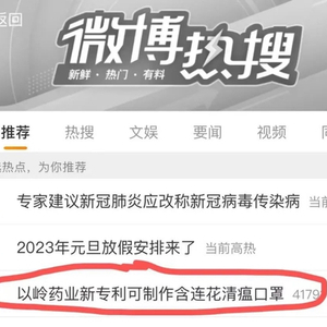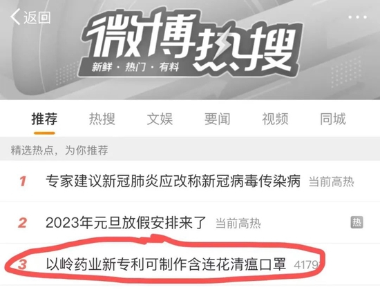 其中,“以岭药业新专利可制作含连花清瘟口罩”一度冲上微博热搜第三名。