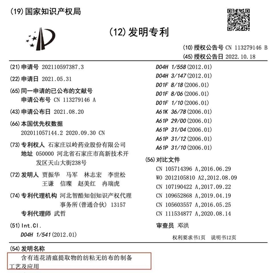 天眼查显示,近期,以岭药业“含有连花清瘟提取物的纺粘无纺布的制备工艺及应用”专利获授权。专利说明书显示,通过该专利技术可将68%的连花清瘟有效成分附着在纺粘无纺布上。