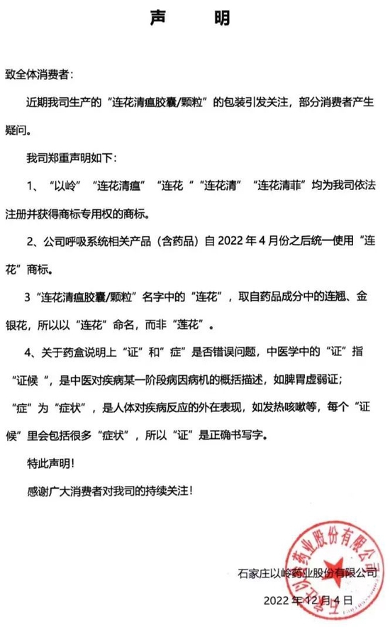 12月5日,以岭药业在官方公众号上发布声明,回应了近期网络上对“连花清瘟胶囊/颗粒”名字中的“连花”和药盒上的“证”字是否正确的关注。