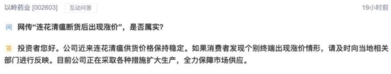 记者注意到,在投资者互动平台,近几日,许多投资者也提出了“网传连花清瘟断货后出现涨价?”“传闻‘以岭药业连花清瘟涨价’,是真的吗?”等问题。