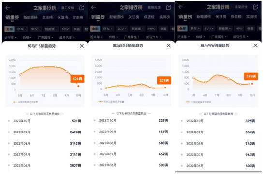 汽车之家统计数据,2022年5-10月六个月内,威马出品的E5销量从8月最高销量3142辆到10月猛跌落至501辆,销量下滑达84.54%。