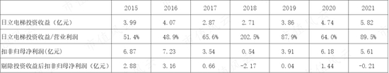 历史上对日立电梯的投资收益占营业利润的比重均较高,2021年,如果剔除该部分投资收益,实际扣非归母净利润甚至为负数。可见主业经营情况并不乐观。