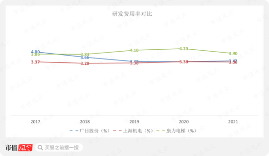 结合研发投入来看的话,近几年公司研发费用率有所下降,且低于康力电梯,整体研发投入强度不高。
