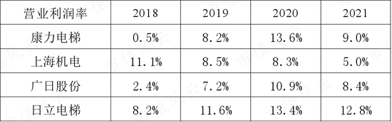 日立电梯定位高端市场,盈利能力相对更为稳定,参考2021年营业利润率,在成本压力下,日立电梯表现明显好于其他上市同行。