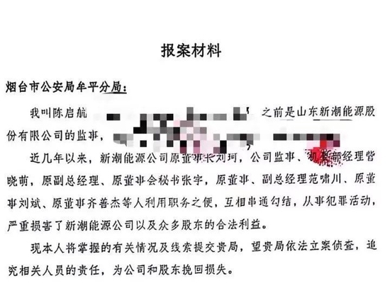 近日,有媒体报道,新潮能源(600777.SH)原监事会主席陈启航向烟台市公安局报案,称新潮能源原董事长刘珂、监事兼机要部经理訾晓萌等6名核心高管挪用、侵占公司资金,已于2021年11月12日获得受理,但风暴中心的新潮能源却没有进行信息披露。