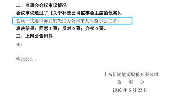 2018年6月15日,陈启航出任新潮能源监事,直至2020年4月29日离任,陈启航在该岗位任职近23个月,并有15个月担任公司第九届监事会主席。