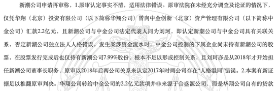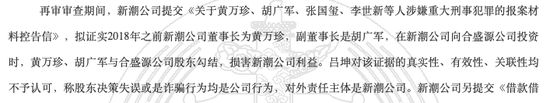 对于合盛源一案,新潮公司曾在裁判文书中表示,发生案涉资金流水时,中金公司控制的下属企业尚未持有新潮公司的股票,在股票发行完成后也仅持有新潮公司7.99%股份,根本不足以形成控制关系,且刘珂亦是从2018年才开始担任新潮公司董事长职务。2018年之前新潮公司董事长为黄万珍,副董事长是胡广军,在新潮公司向合盛源公司投资时,黄万珍、胡广军与合盛源公司股东勾结,损害新潮公司利益。