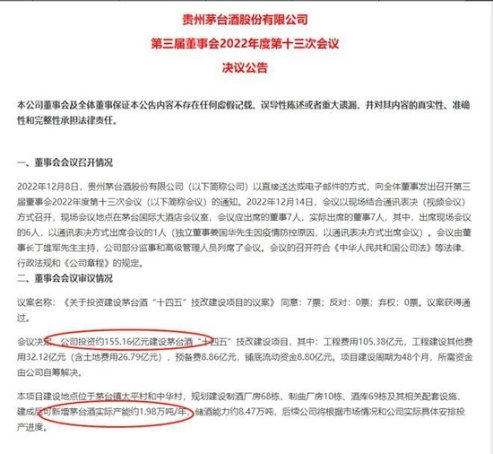 12月14日晚间,贵州茅台公告,公司拟投资约155.16亿元建设茅台酒“十四五”技改建设项目,建成后可新增茅台酒实际产能约1.98万吨/年,储酒能力约8.47万吨。项目建设周期为48个月,所需资金由公司自筹解决。